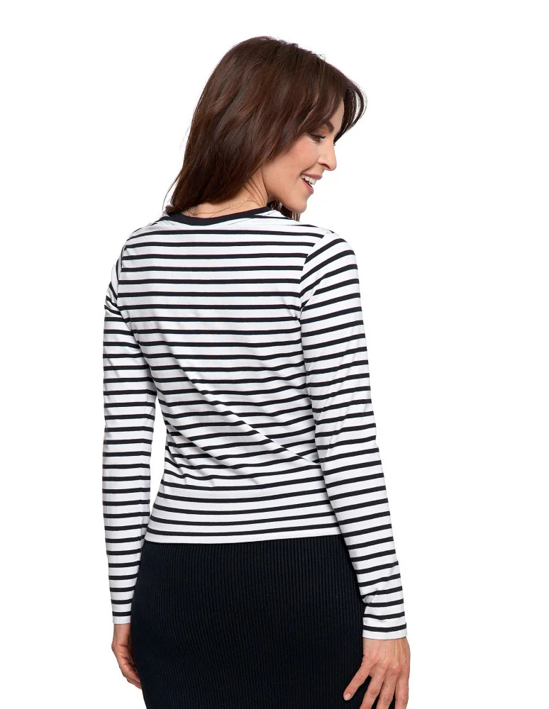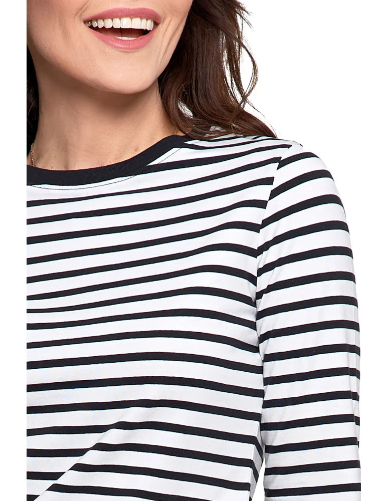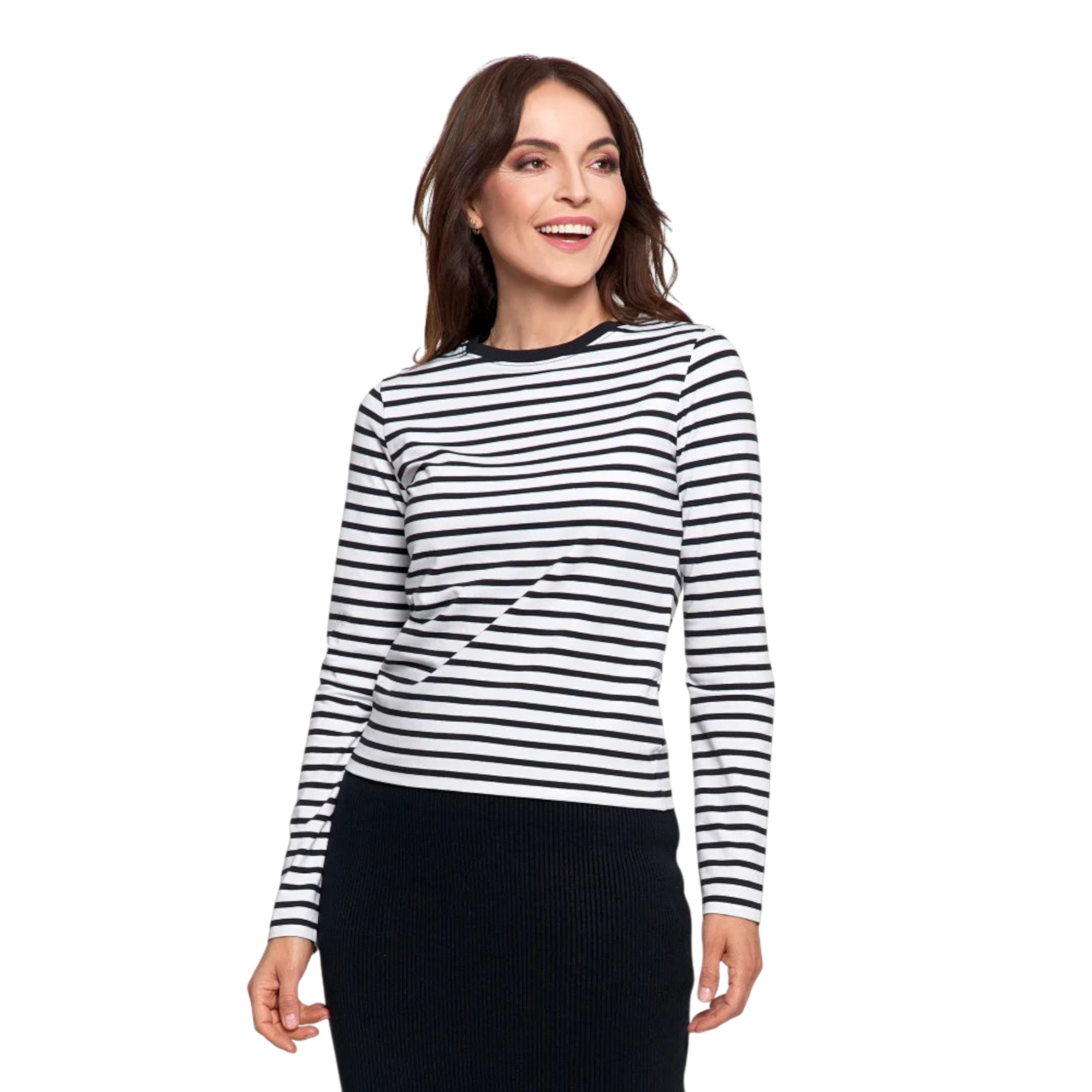 • Klasyczna koszulka damska w paski z okrągłym dekoltem to ponadczasowy element garderoby, który doskonale sprawdzi się o każdej porze roku