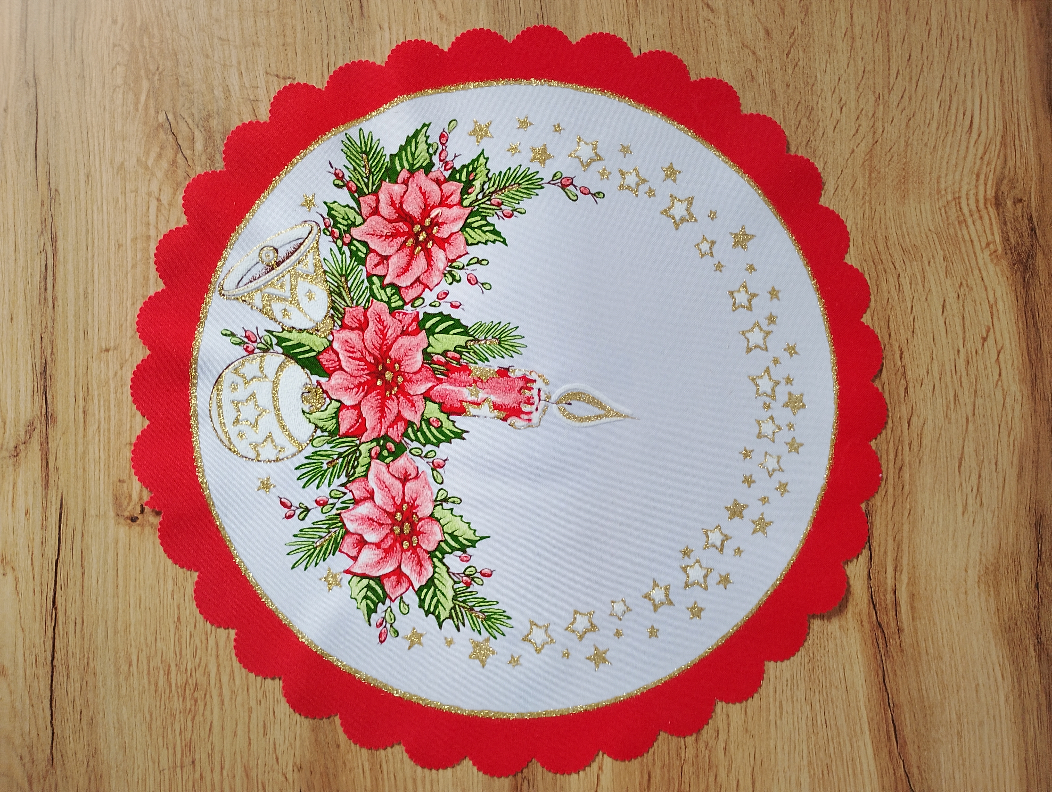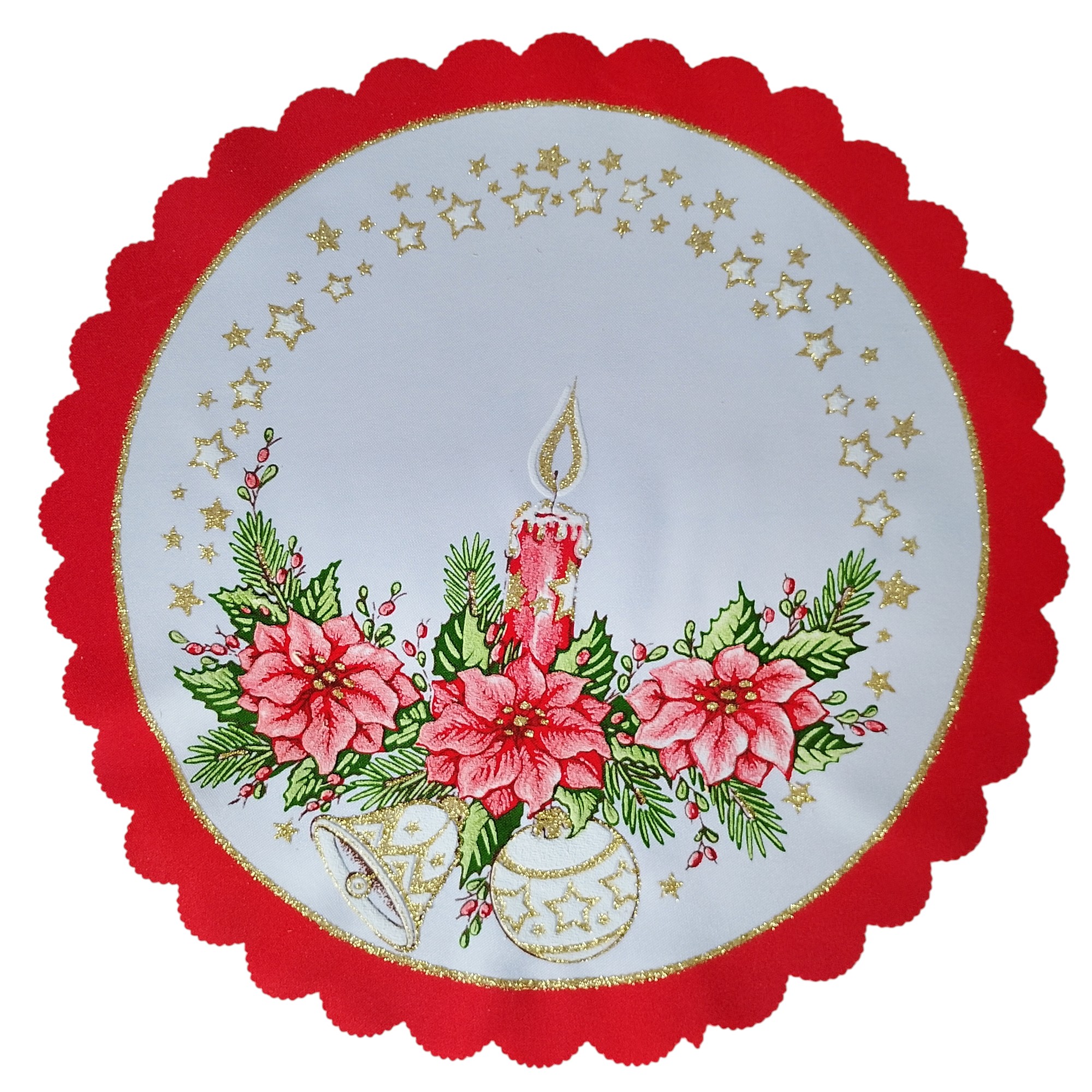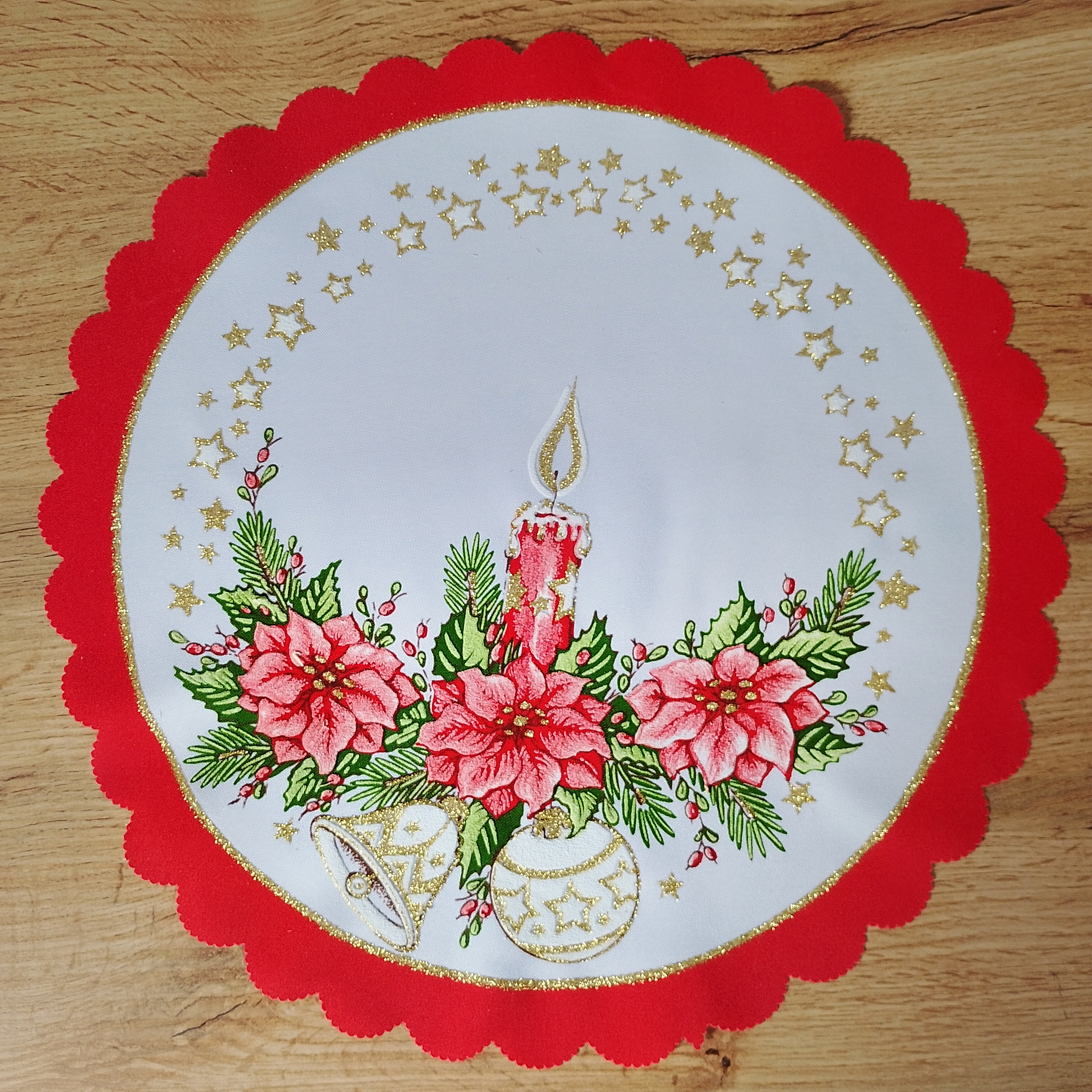 • Piękna, okrągła serwetka świąteczna wykonana z gładkiej tkaniny zdobionej eleganckim, haftowanym motywem bożonarodzeniowym.