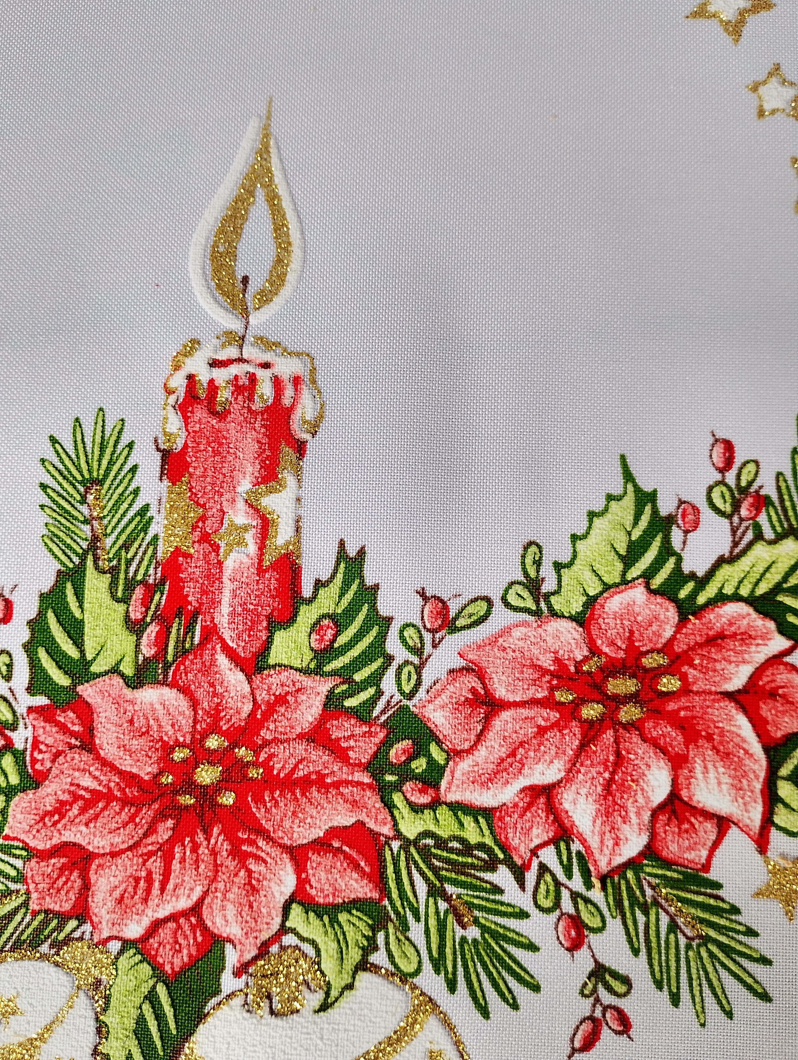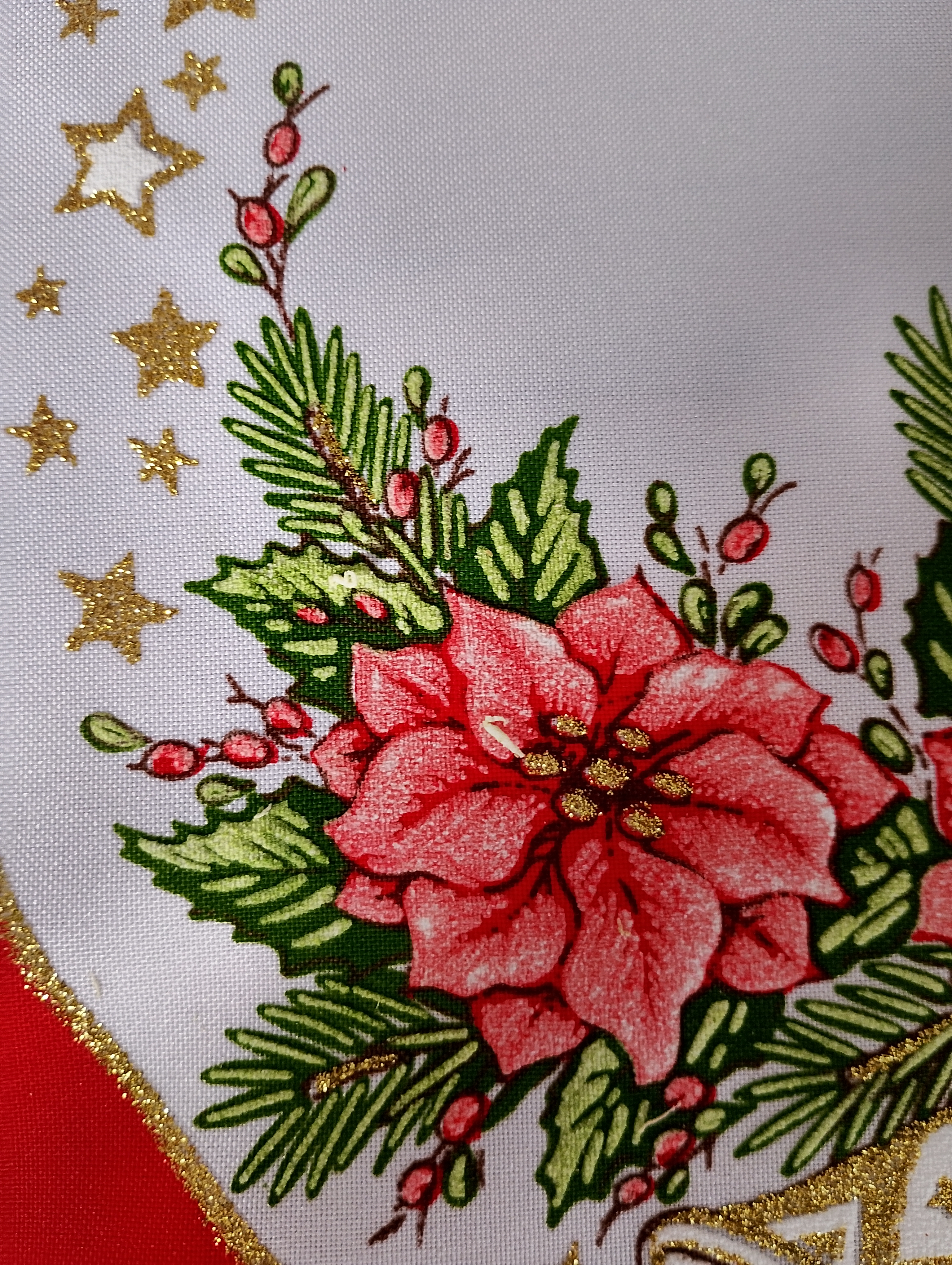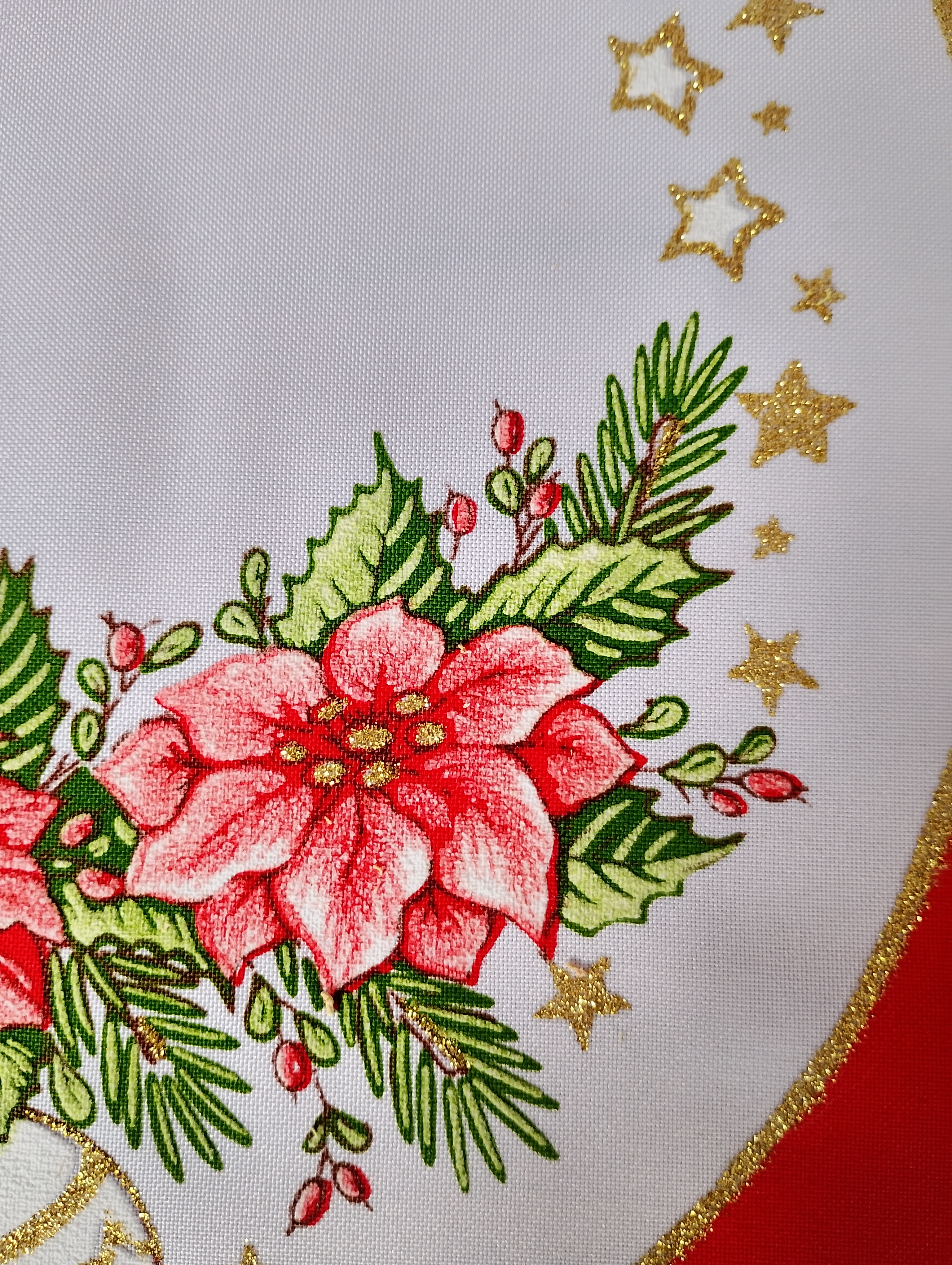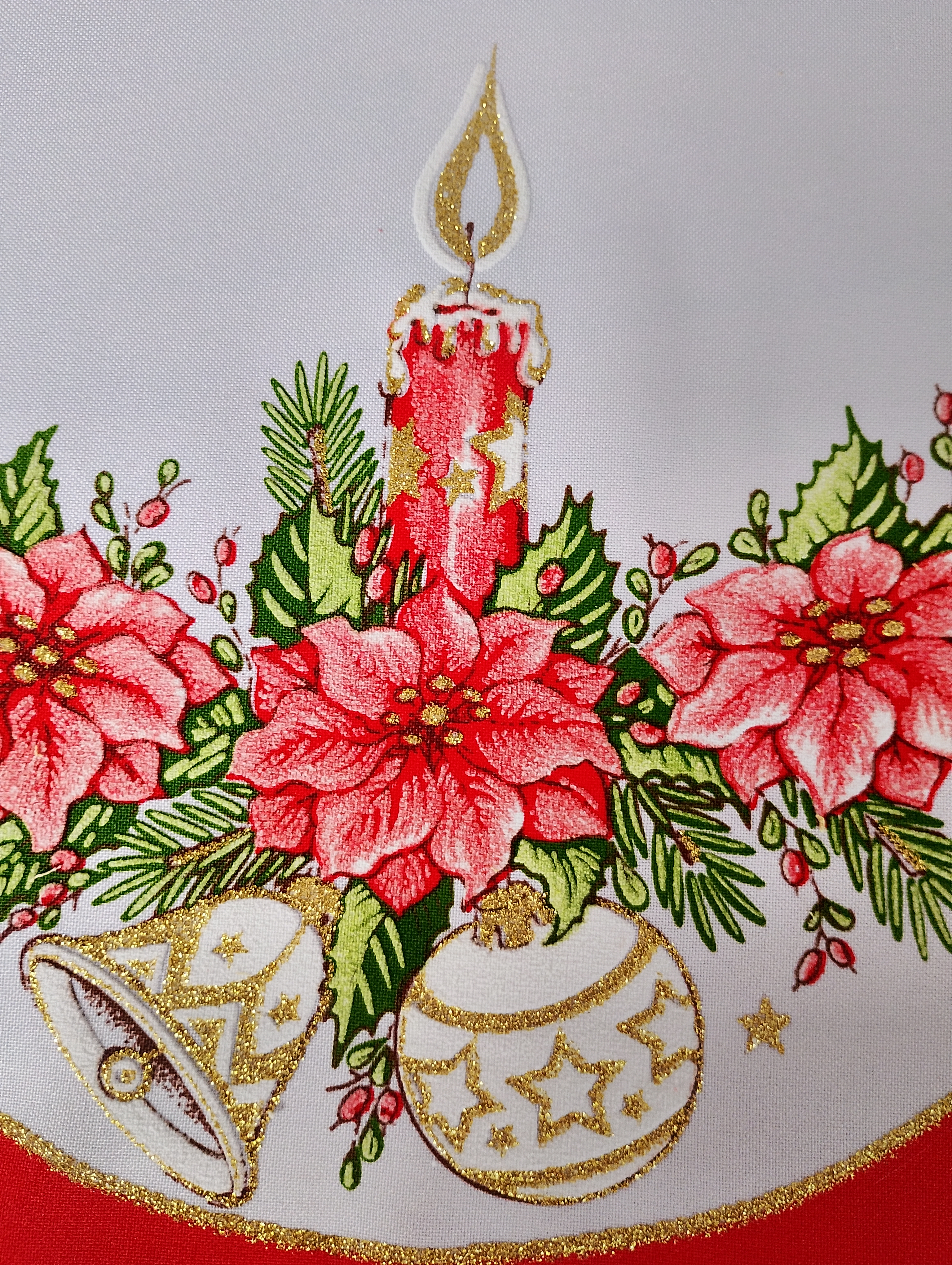 • Piękna, okrągła serwetka świąteczna wykonana z gładkiej tkaniny zdobionej eleganckim, haftowanym motywem bożonarodzeniowym.