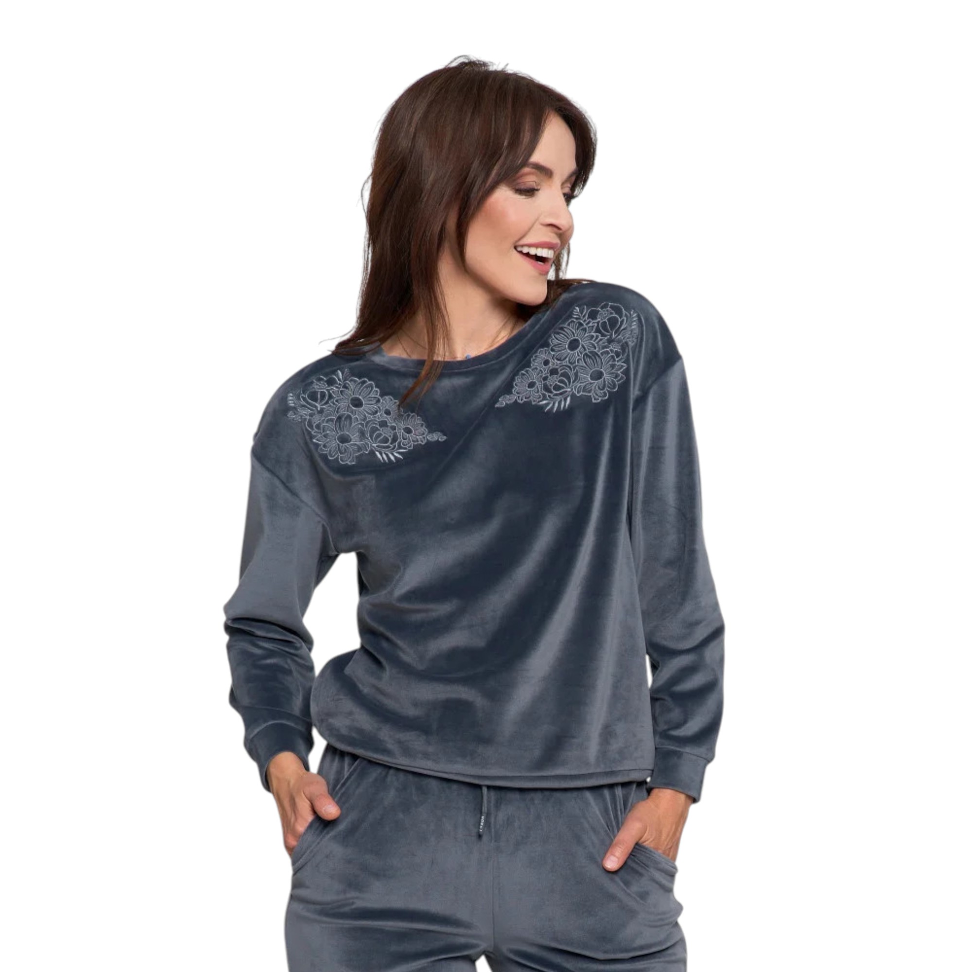 Strona główna » Odzież damska » Odzież sportowa » Damska bluza WELUROWA przez głowę z haftem MORAJ GRAFITOWA
