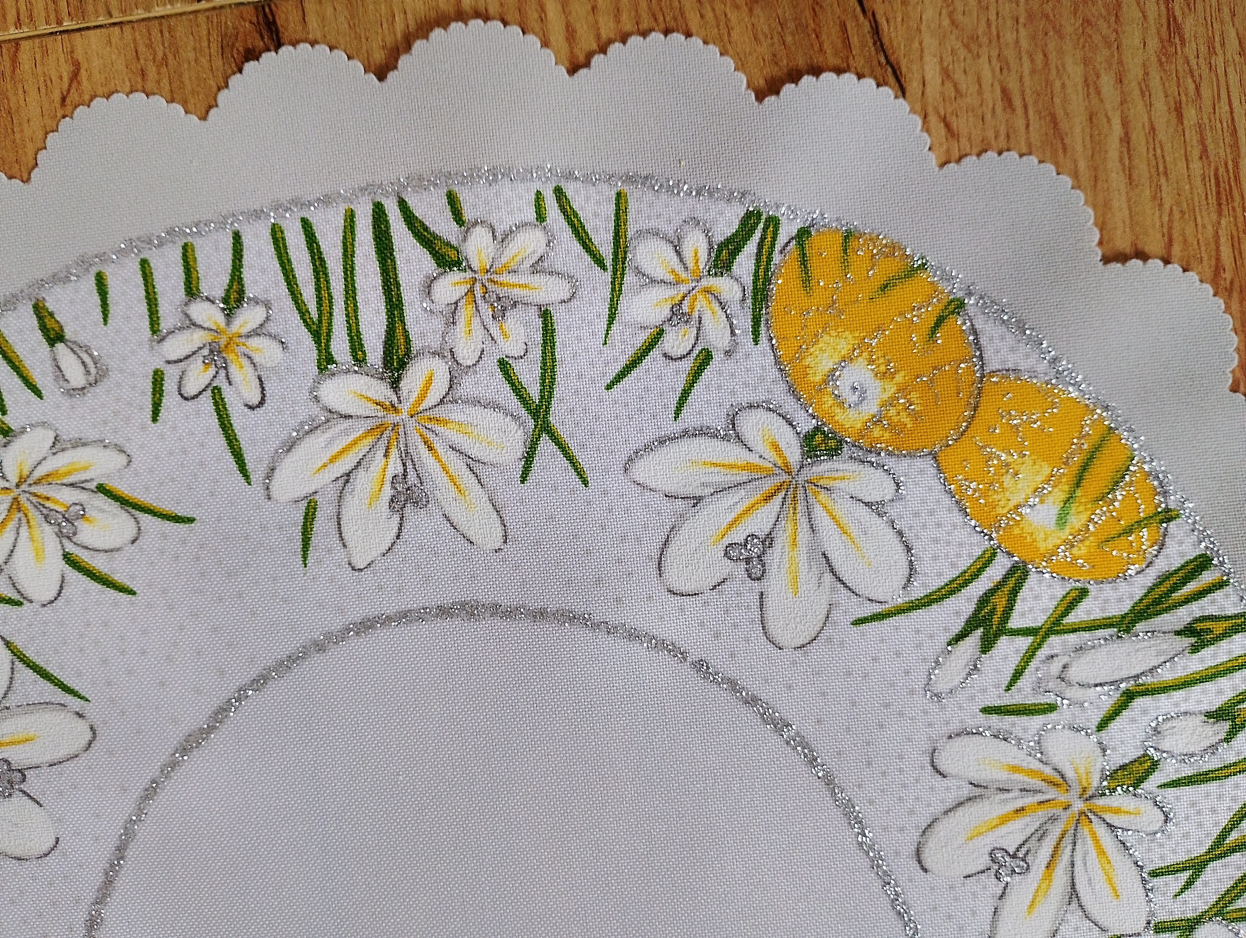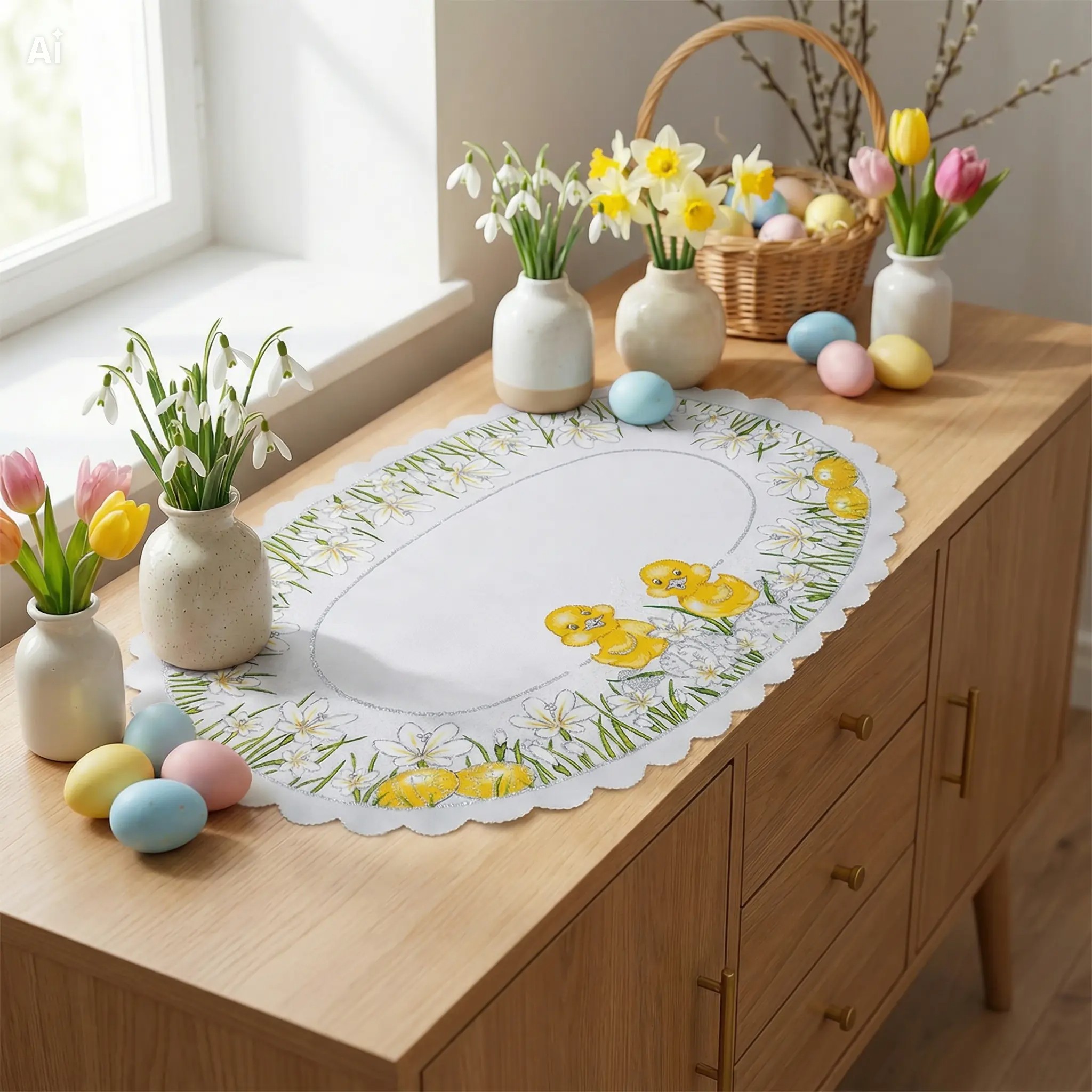 • Elegancka serwetka dekoracyjna, która pięknie ozdobi stół, komodę w okresie wiosennym oraz wielkanocnym.