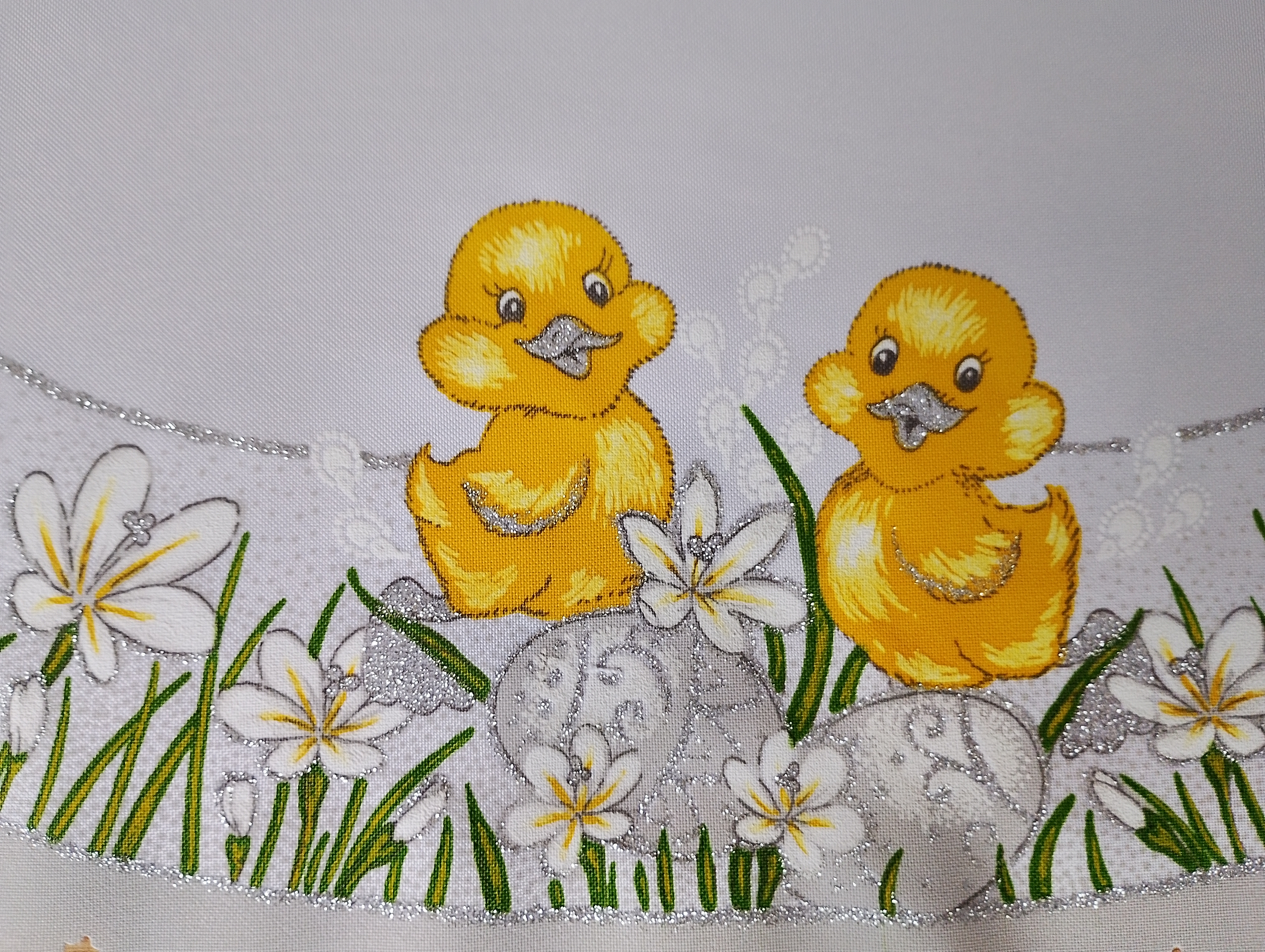• Delikatny wzór żółtych kurczaczków z szarymi pisankami, a dookoła białe stokrotki co komponuje się rewelacyjne.