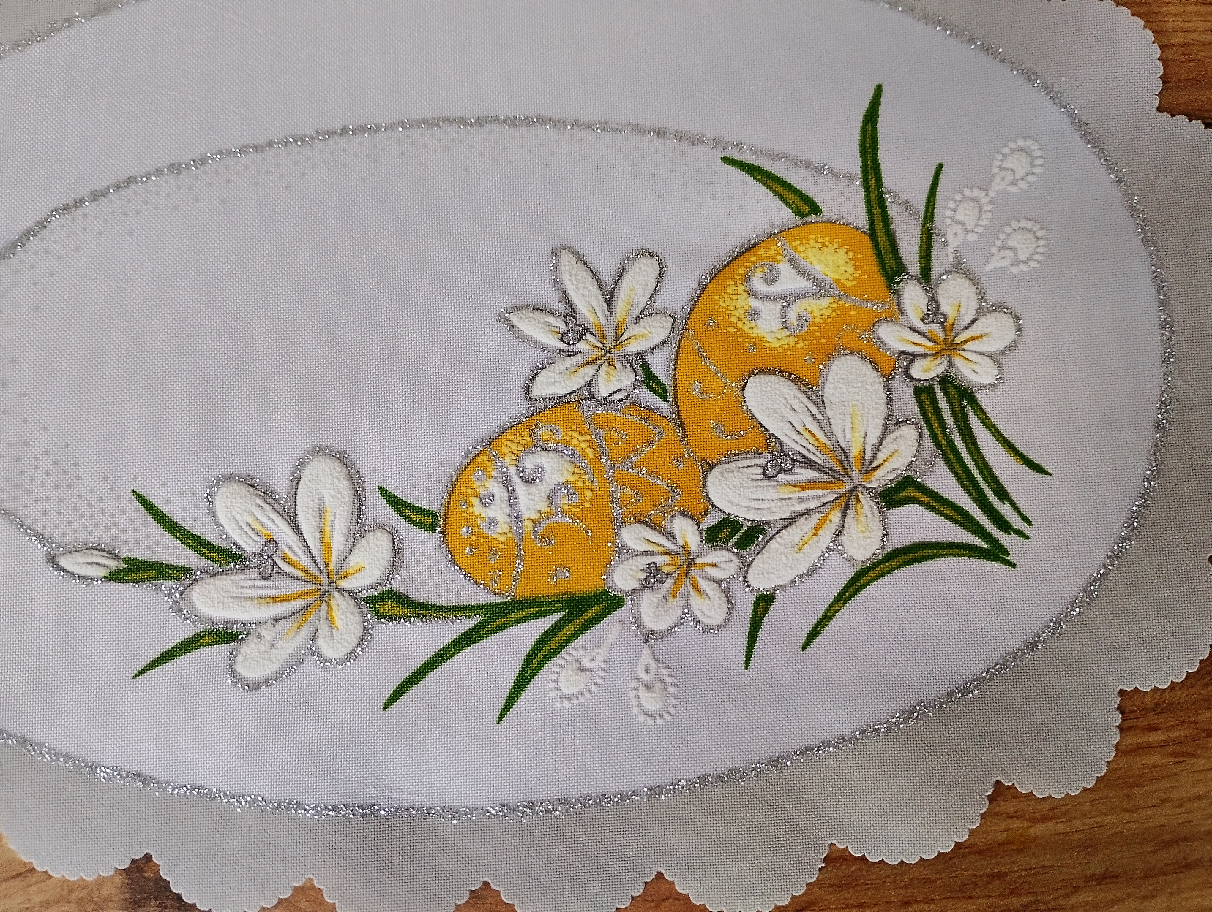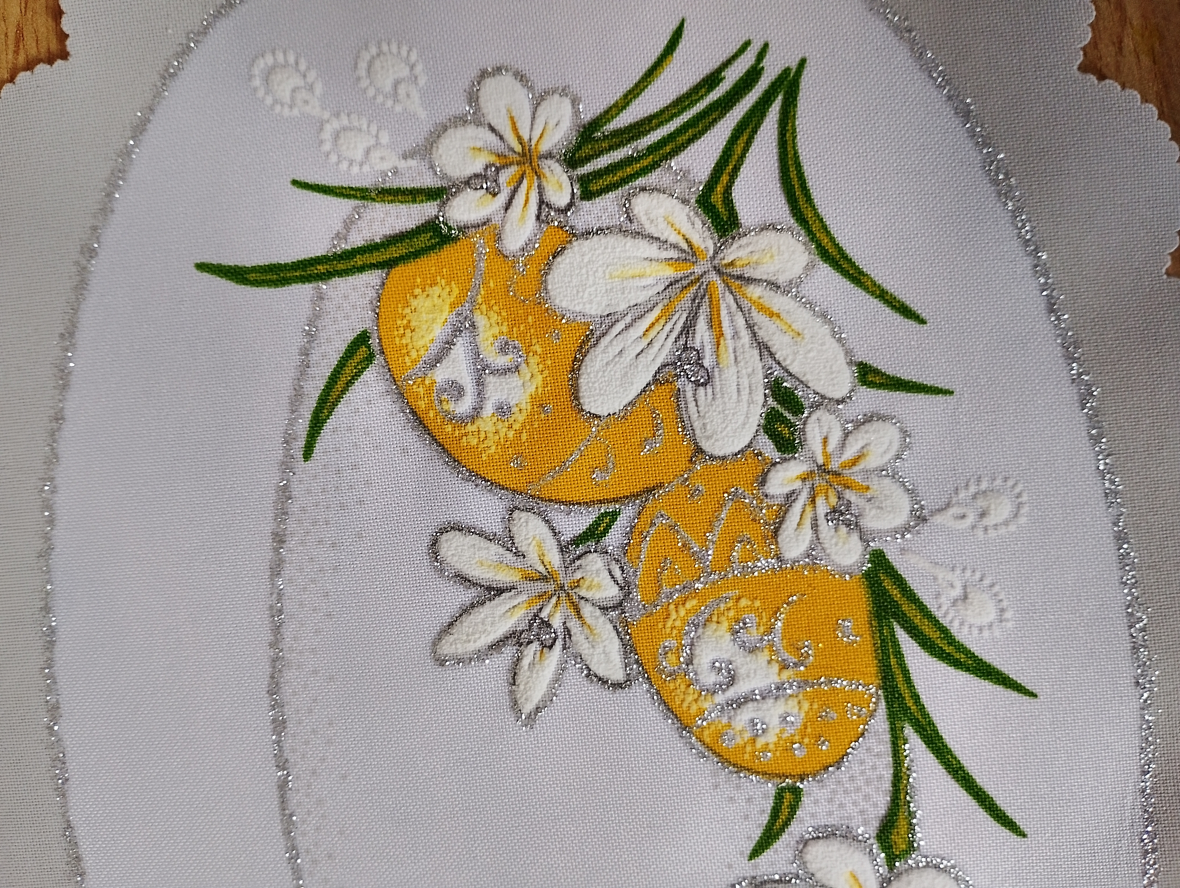 • Elegancka serwetka dekoracyjna, która pięknie ozdobi stół, komodę w okresie wiosennym oraz wielkanocnym.