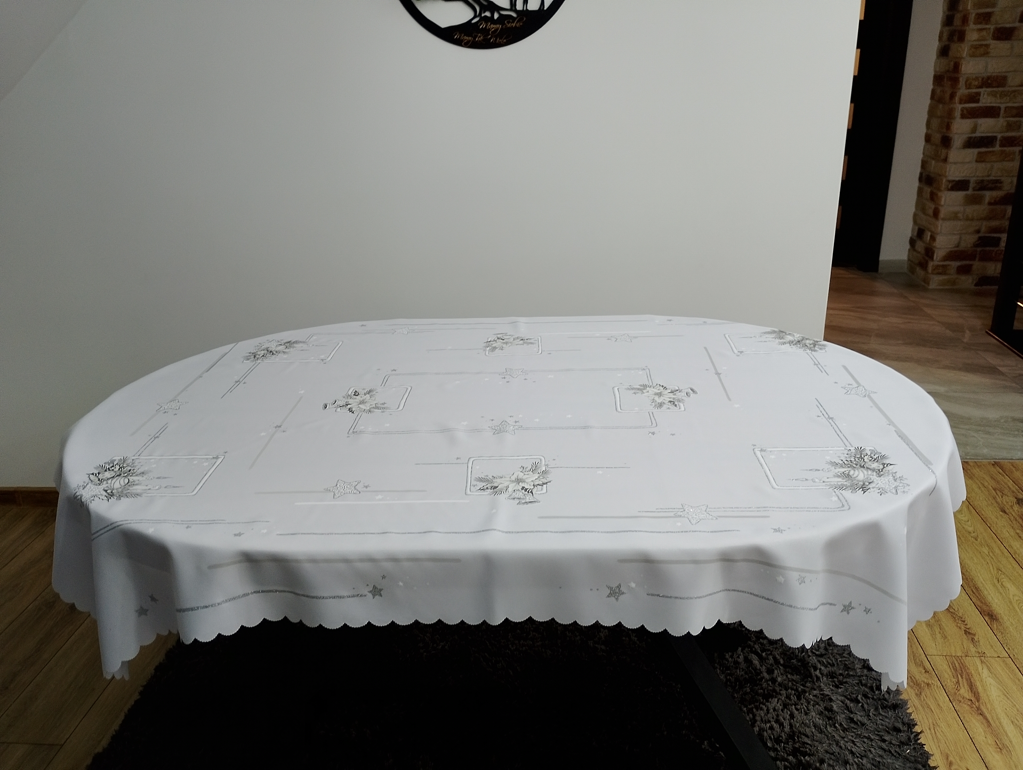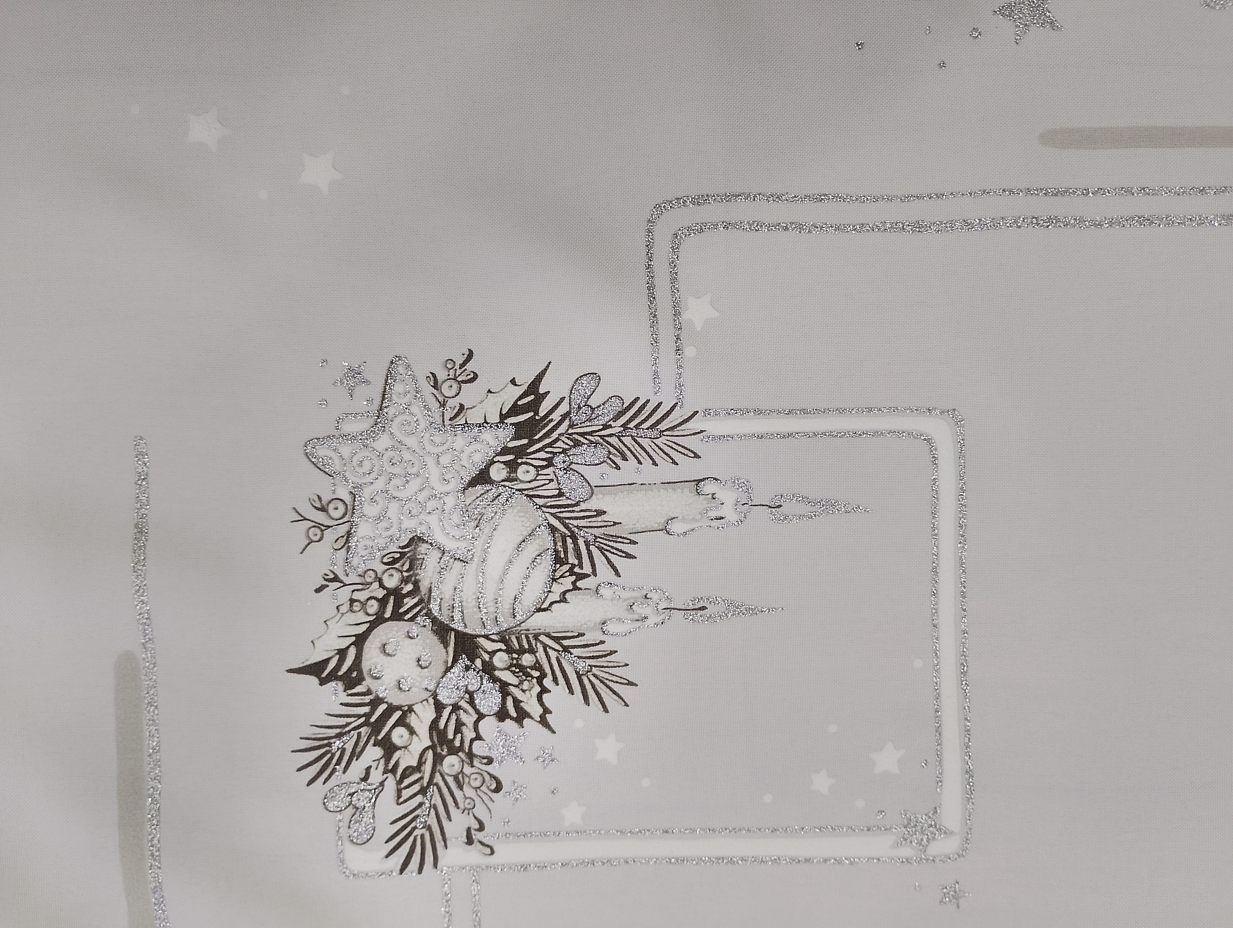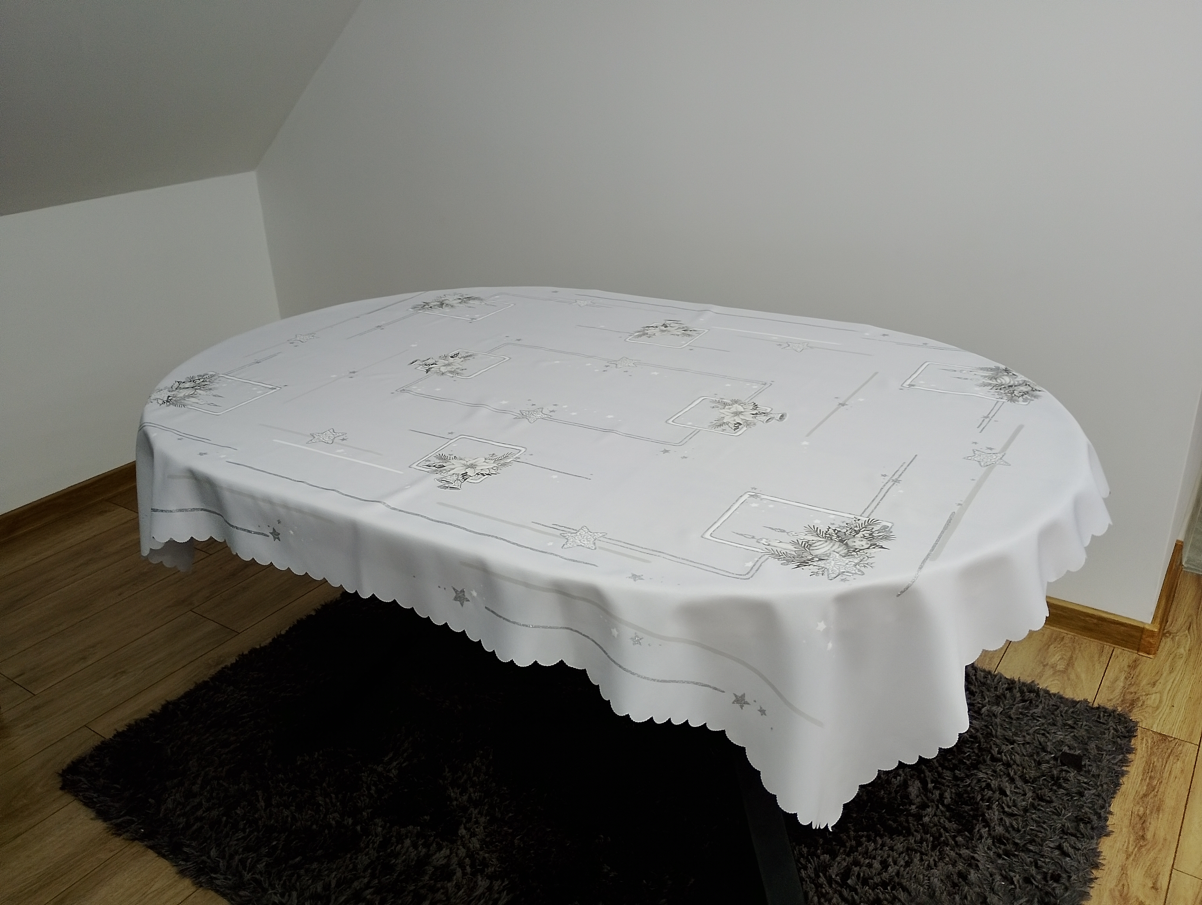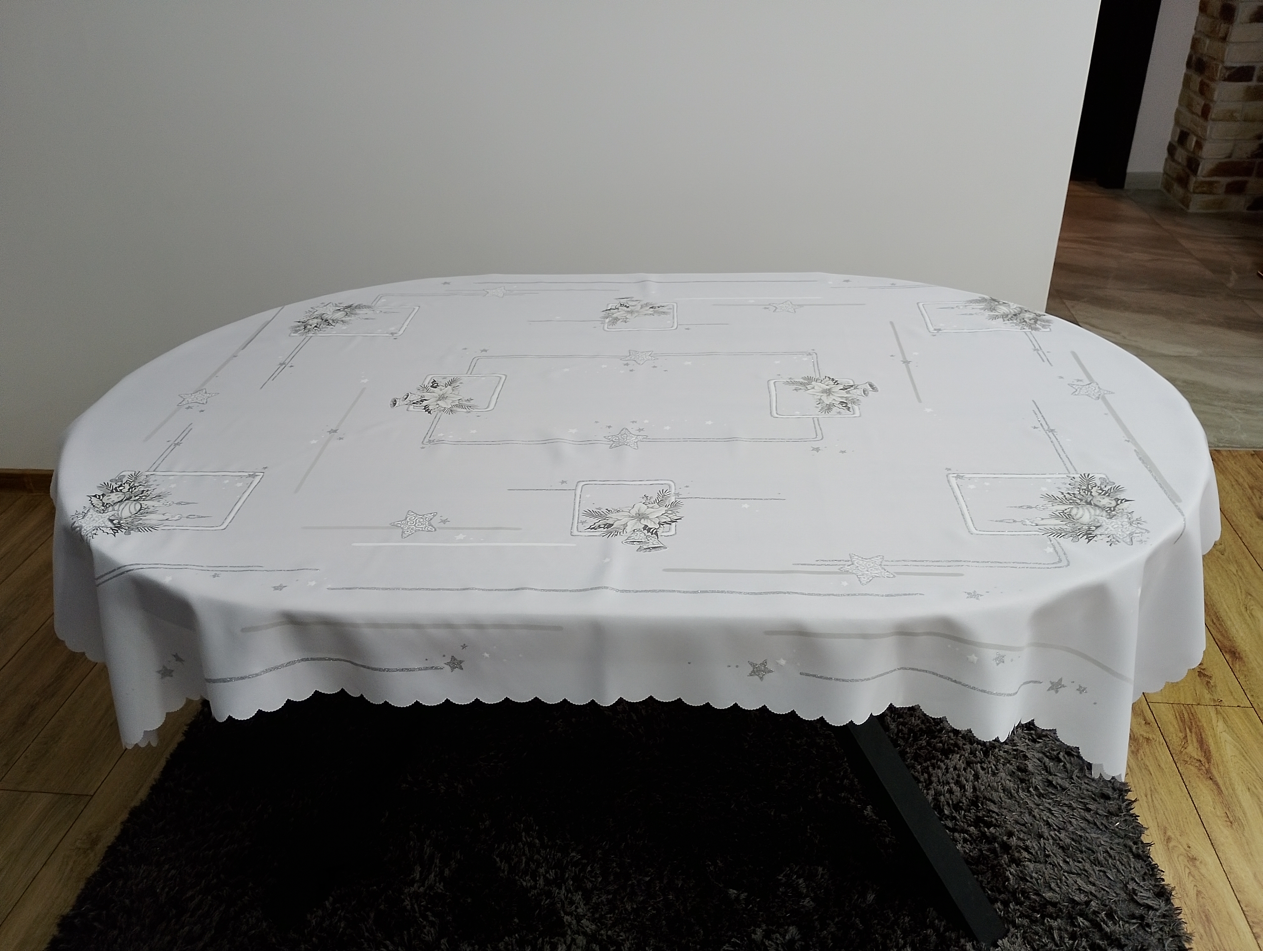 • Obrus dodatkowo zdobiony jest srebrnym brokatem, który pięknie połyskuje w świetle, podkreślając świąteczny charakter dekoracji.
