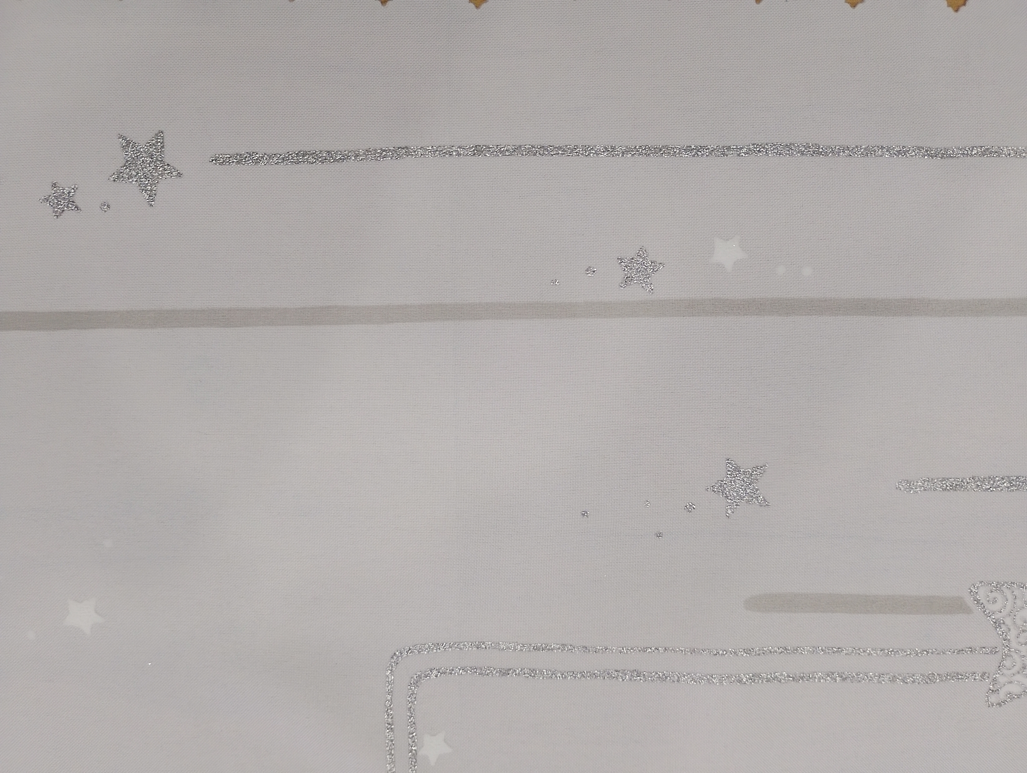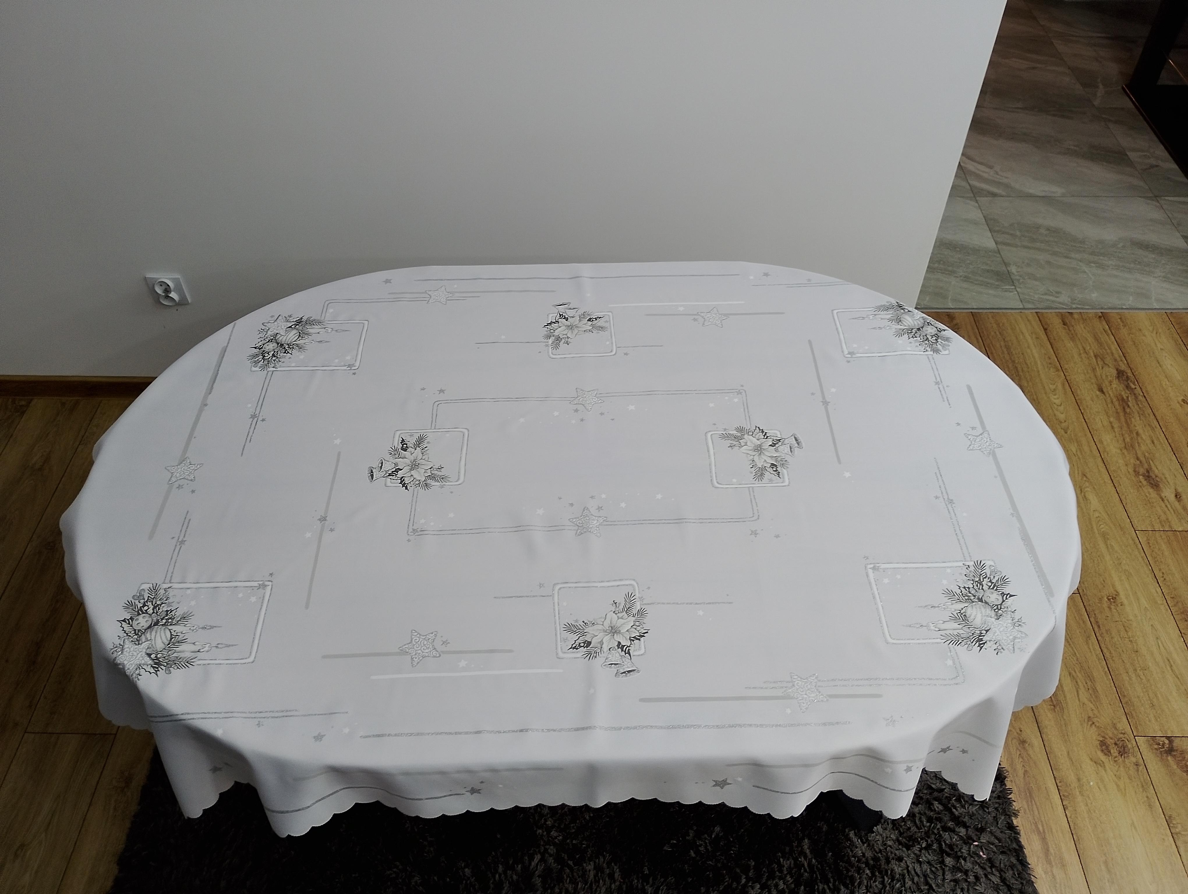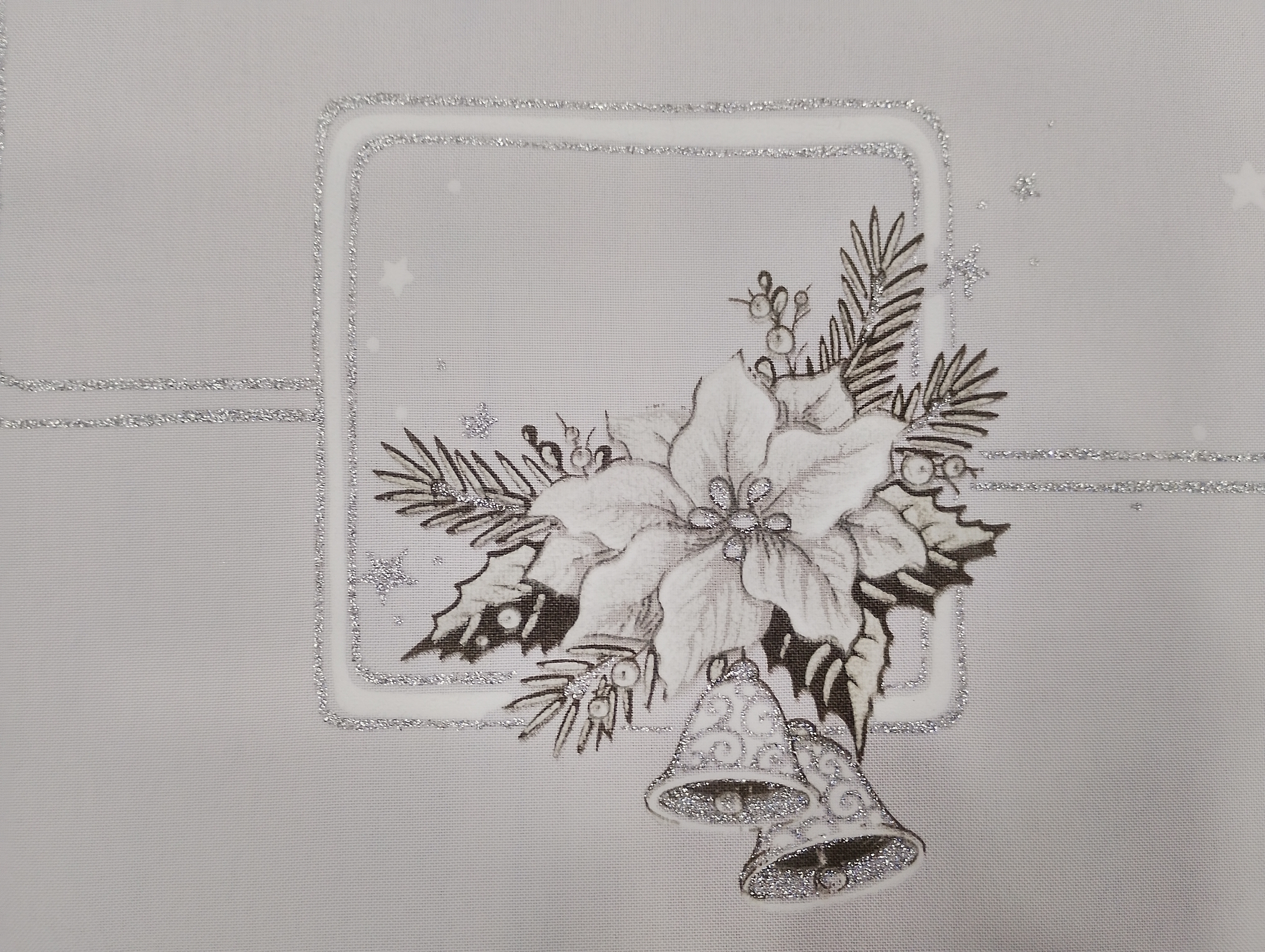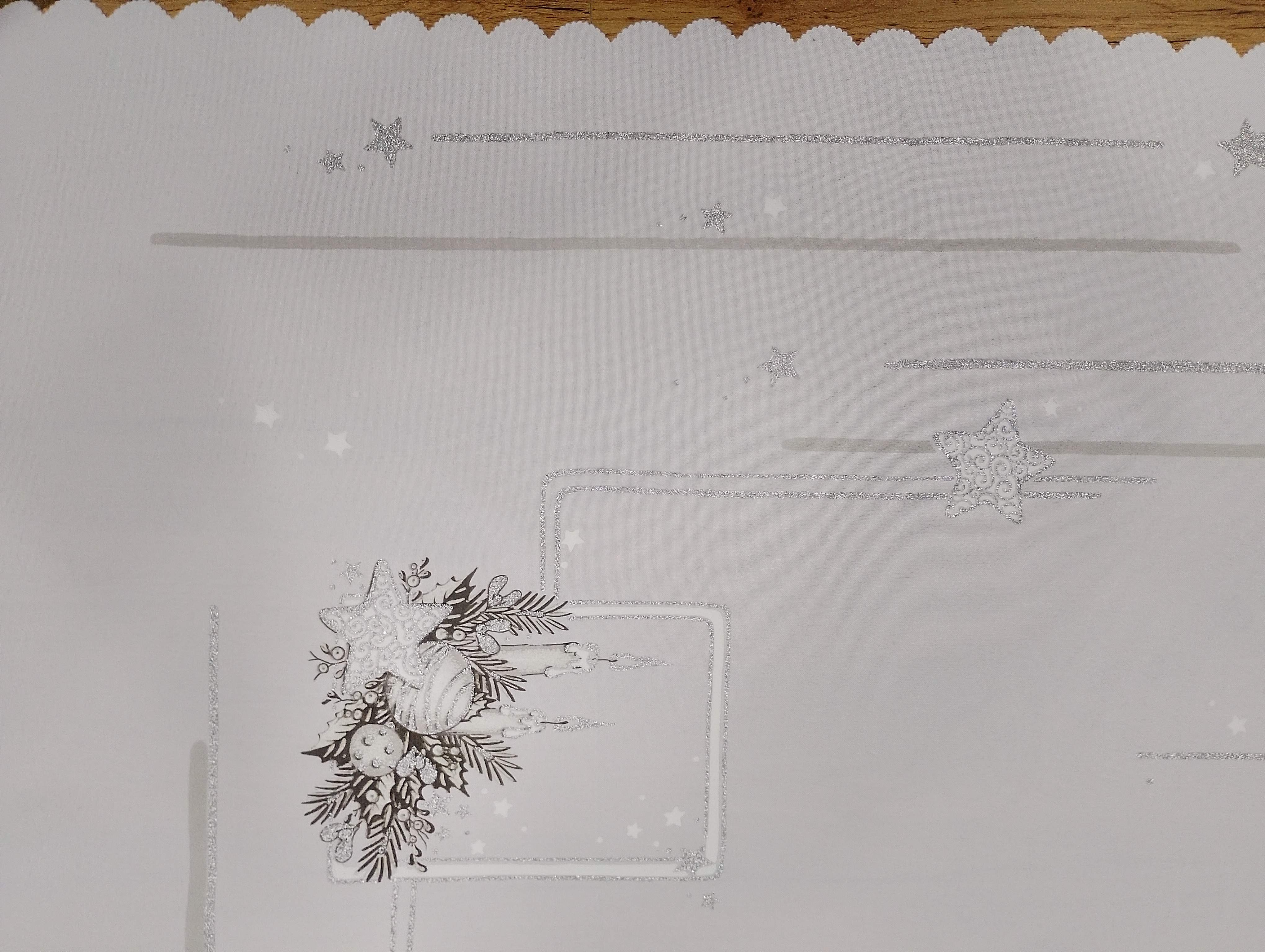 • Obrus dodatkowo zdobiony jest srebrnym brokatem, który pięknie połyskuje w świetle, podkreślając świąteczny charakter dekoracji.