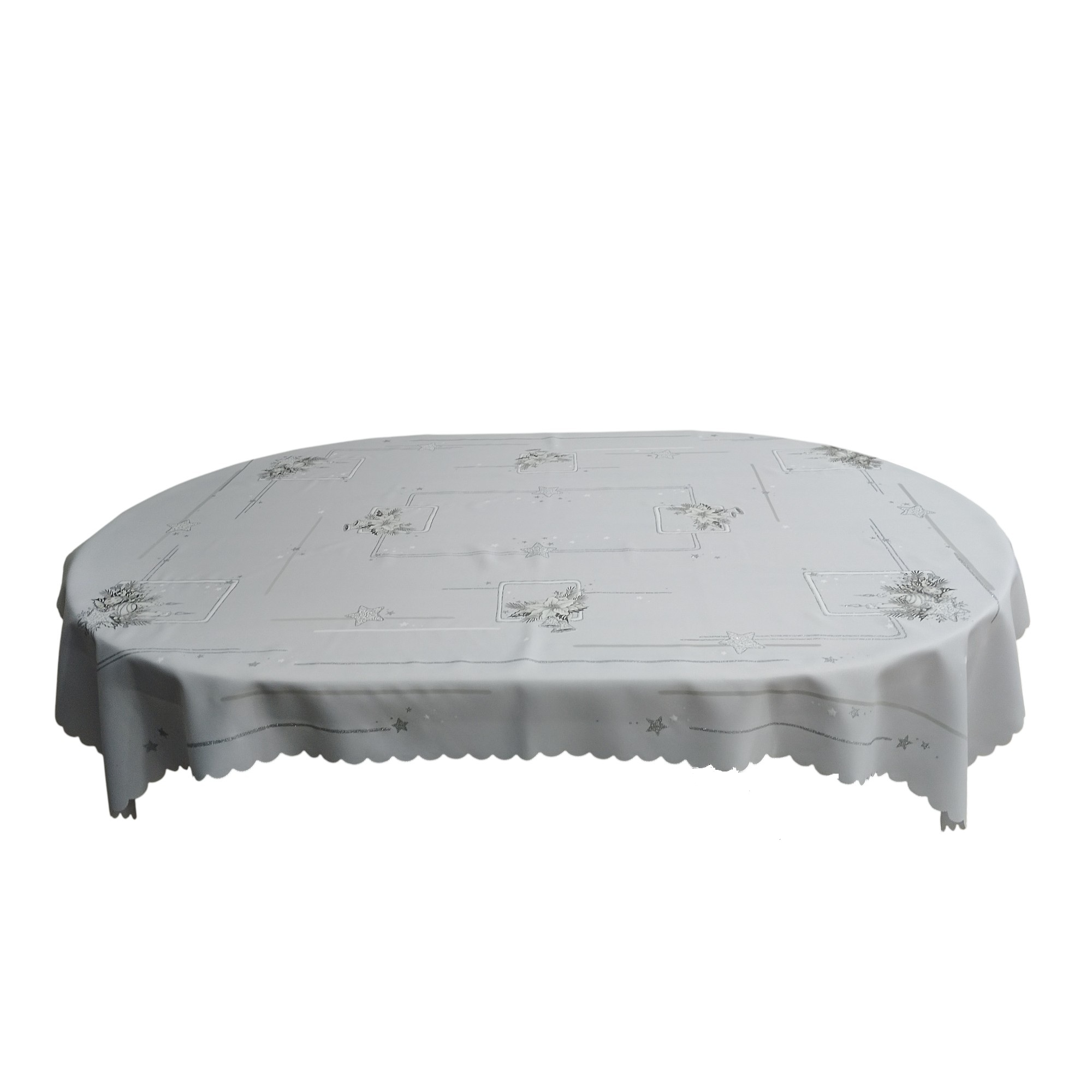 PIĘKNY OBRUS ŚWIĄTECZNY 120x160 cm BIAŁO-SZARY gwiazdki świece dzwoneczki gałązki