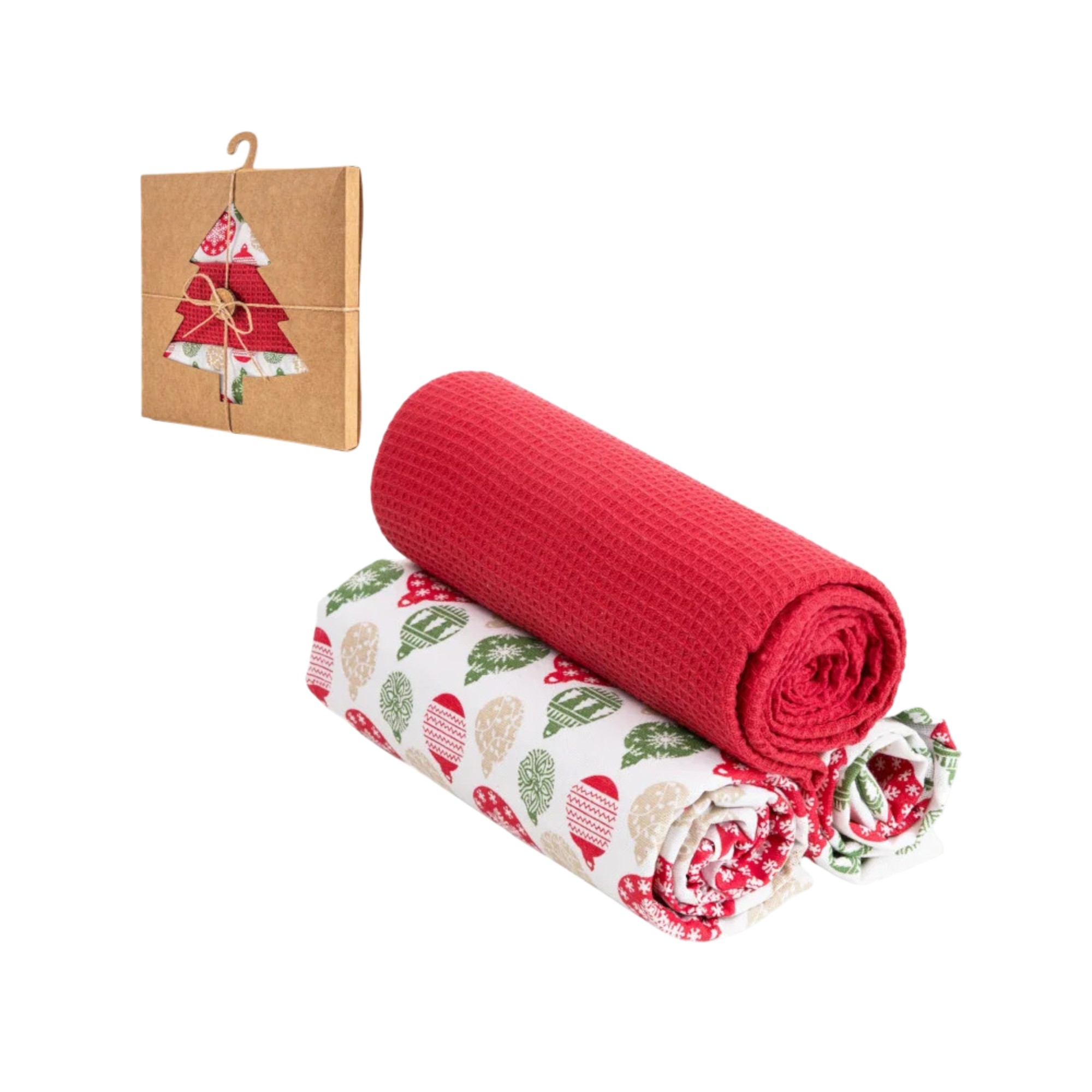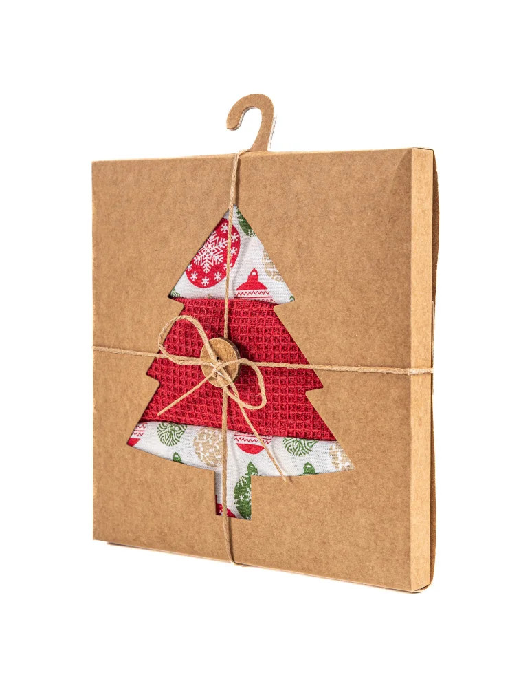 • W komplecie znajdują się trzy ściereczki: dwie ozdobione uroczymi bombkami oraz jedna w klasycznej, głębokiej czerwieni o strukturze waflowej.