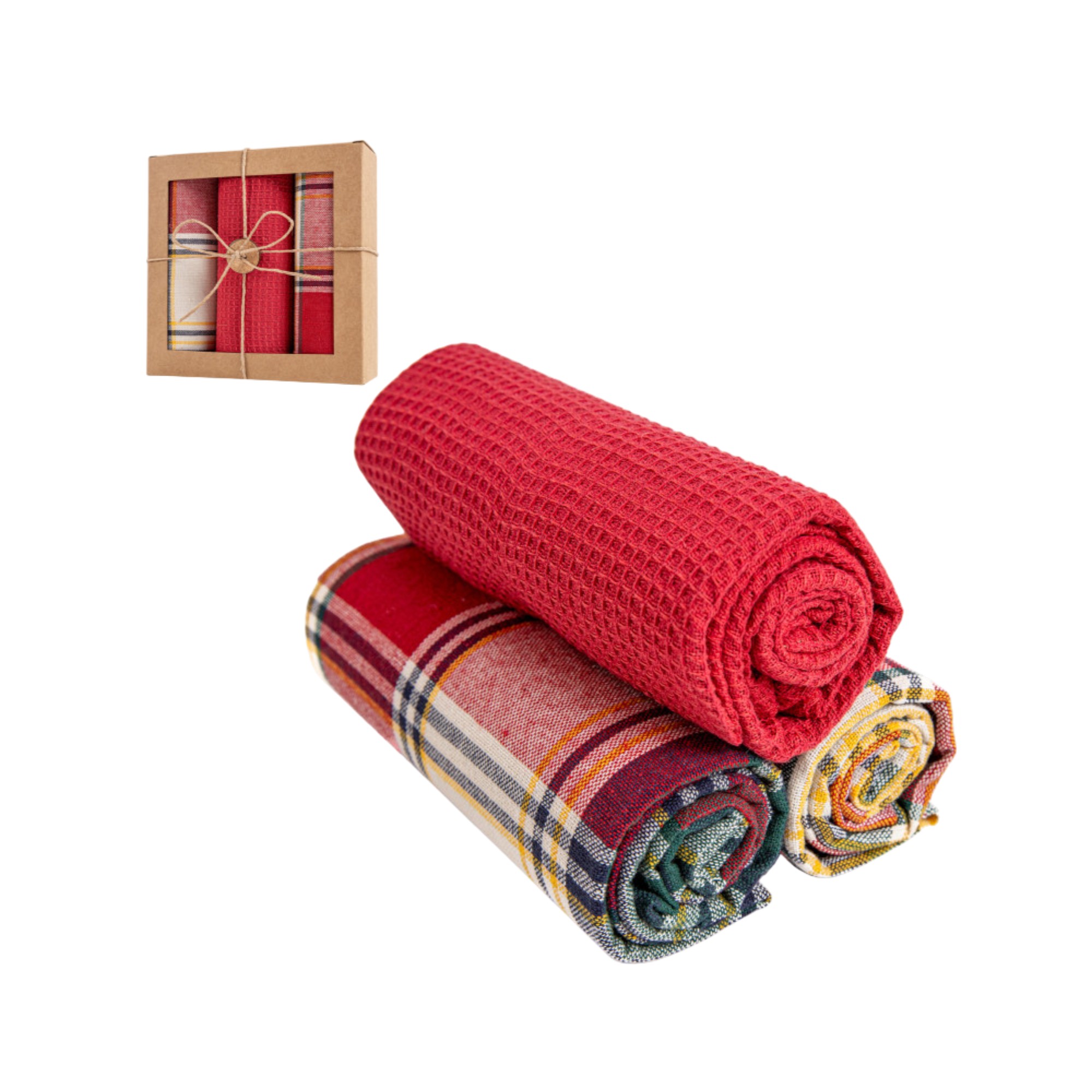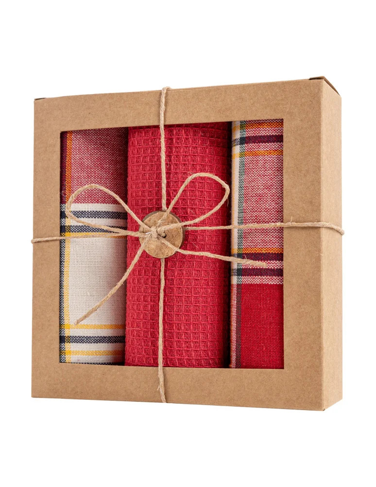 • Zestaw zawiera: 2 ręczniki w klasyczną świąteczną kratę w odcieniach czerwieni, zieleni, kremu i żółci,  1 ręcznik w jednolitym czerwonym kolorze z chłonną strukturą waflową